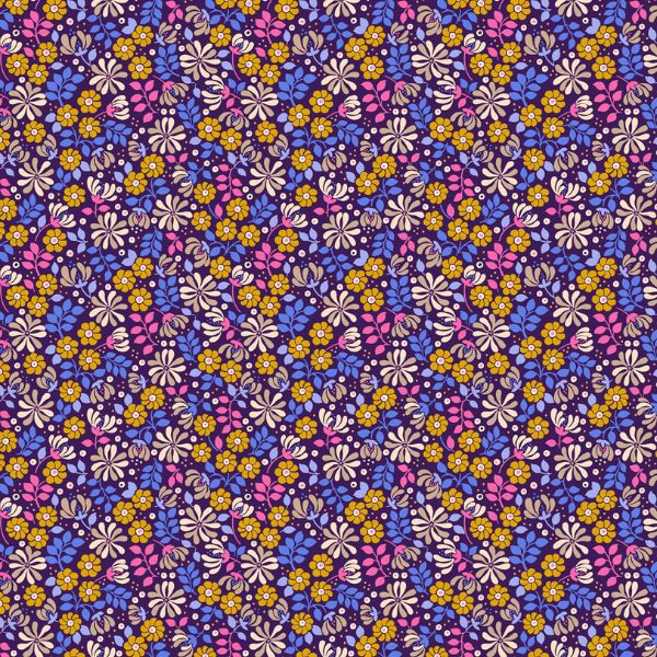 L15.C Floral Burst on Dark Purple, Boho Blooms by Lewis & Irene is featuring a lively mix of orange blossoms and foliage. The design is a celebration of colour and charm. Scattered daisy style flowers and delicate leaves create a joyful, nature inspired print that radiates energy and warmth. Perfect for quilts, apparel, and cheerful home décor, this fabric brings a playful floral touch to any project.