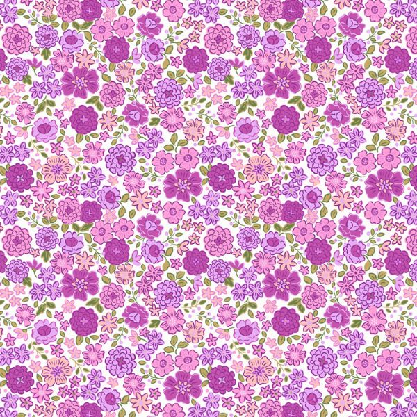 L16.B Boho Blooms Pretty Purples, Boho Blooms by Lewis & Irene is featuring a lush array of blossoms in warm pinks, peaches. The design captures the essence of summer in full bloom. Layered floral motifs in varying sizes create depth and movement, while the soft background enhances the richness of the colour’s. Perfect for quilts, garments, and home décor, this design brings a vibrant yet romantic feel to any creative project.