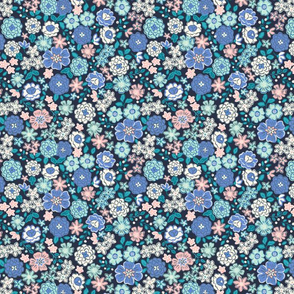 L16.D Boho Blooms Blues and Pinks on Navy, Boho Blooms by Lewis & Irene is featuring a lush array of blossoms in blues and pinks. The design captures the essence of summer in full bloom. Layered floral motifs in varying sizes create depth and movement, while the soft background enhances the richness of the colour’s. Perfect for quilts, garments, and home décor, this design brings a vibrant yet romantic feel to any creative project.