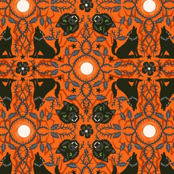 L7 Beware of the Werewolves (glow in the dark), Transylvania Glow, Lewis & Irene features a mirrored pattern of werewolf faces and werewolves howling at the moon with intertwining vines and leaves on a vibrant orange background.