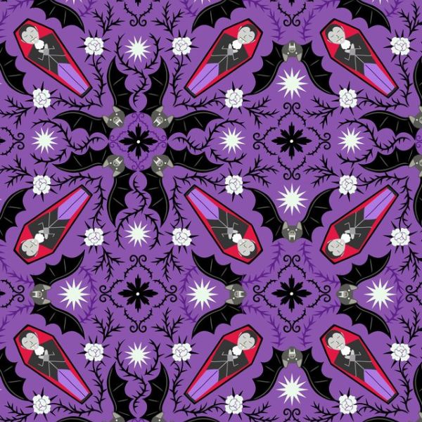 L7B Dracula’s Bed (glow in the dark), Transylvania Glow, Lewis & Irene features a kaleidoscope pattern of sleeping Dracula, bats, stars and roses and thorns on a rich purple background.