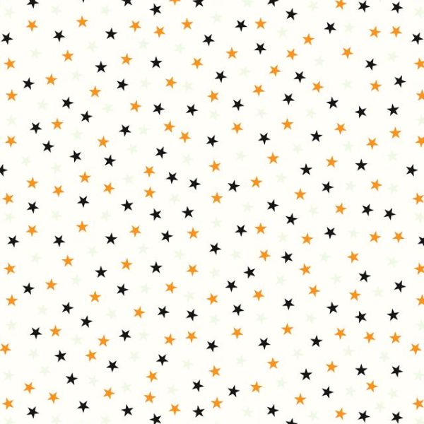 L9A Stars on Cream (glow in the dark), Transylvania Glow, Lewis & Irene features black, orange, and cream stars dotted on a cream background.