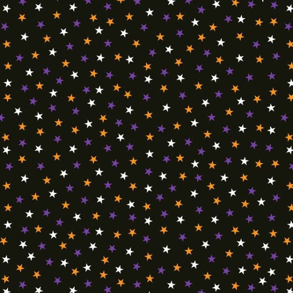 L9C Stars on Black (glow in the dark), Transylvania Glow, Lewis & Irene features purple, orange, and cream stars dotted on a black background.