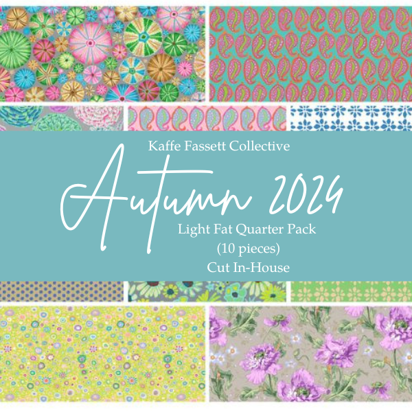 LIGHT Fat Quarter Pack (10pcs) Kaffe Fassett Collective Autumn 2024 (Cut In-House). Featuring re-imagined designs by Kaffe Fassett & new designs from Brandon Mably and Philip Jacobs. This collection features an array of lighter bold florals and geometric shapes.