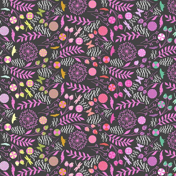 MKTP014.LICORICE Dandelion, Prince Charming Déjà Vu Minky by Tula Pink features is a print of liquorice, leaves, flowers, butterflies and dragonflies of different colours on a dark background.