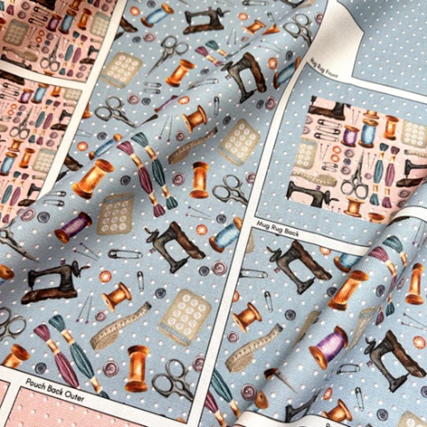 The digitally printed cotton canvas fabric panel has all the pieces, featuring a beautifully illustrated collection of sewing tools and accessories with a vintage vibe, that you need to create your carry pouch and matching mug rug. Just cut the pieces out, sew them together and store your mug safely inside.