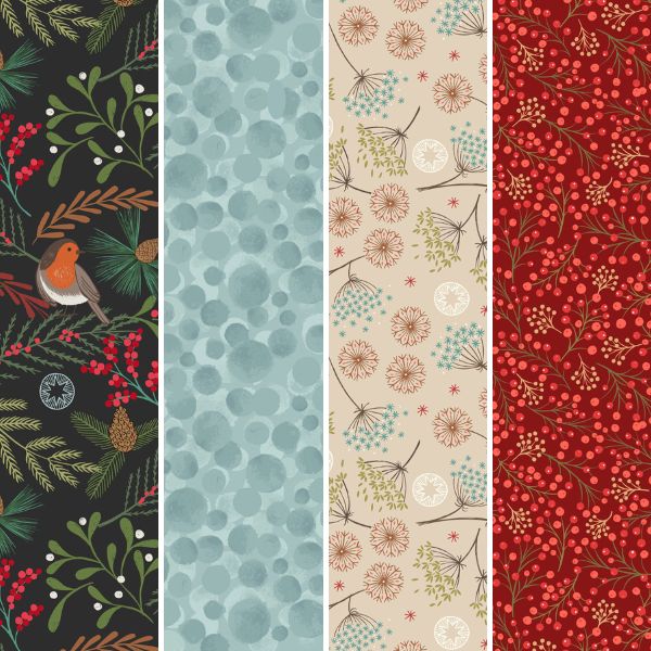 The collection features robins, mistletoe and festive foliage, in a dark, blue, cream and red colour palette.
