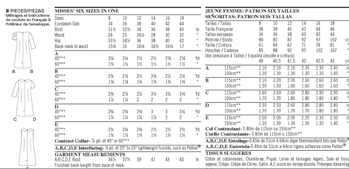 Misses’ knee-length shift dress has wide round neckline with or without bias-cut stand collar and can be made sleeveless or with 3/4 length, short or pleated sleeves. New Look sewing pattern.