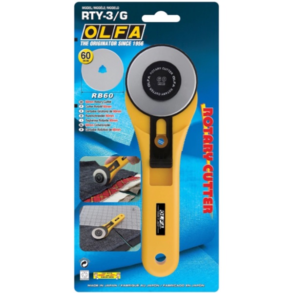 Take your cutting projects to the next level with the Olfa RTY-3\G60mm Rotary Cutter, engineered for strength and precision. Featuring Olfa’s largest rotary blade, it easily slices through thick or multi-layer materials like denim, fleece, canvas, leather, and more.