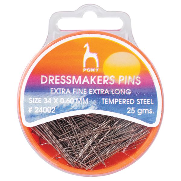 P24002 Pins: Dressmakers. Extra fine long dressmakers pins. Made of tempered steel. 25gms.