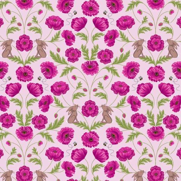 P761.2 Mirrored Poppies and Hares Purple by Lewis & Irene features a beautiful poppy design all over with hares amongst the foliage.