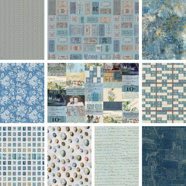Palette Blue Fat Quarter Pack (10 pcs) by Tim Holtz features blue designs of the found and forgotten – combining salvaged ephemera, typography and photographs with nostalgic prints.