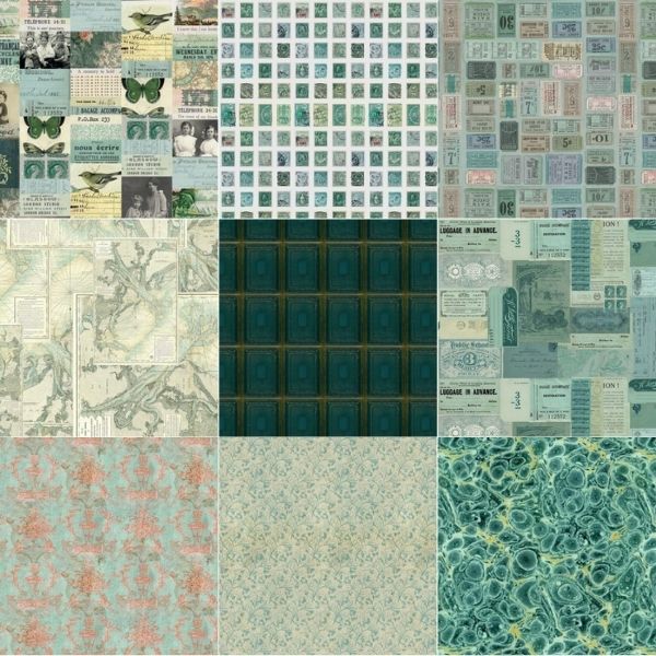 Palette Teal Fat Quarter Pack (9 pcs) by Tim Holtz features a selection of teal designs of the found and forgotten – combining salvaged ephemera, typography and photographs with nostalgic prints.