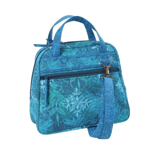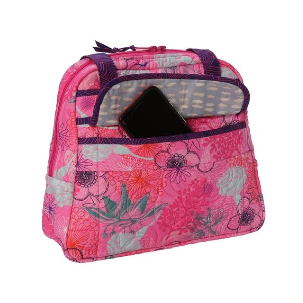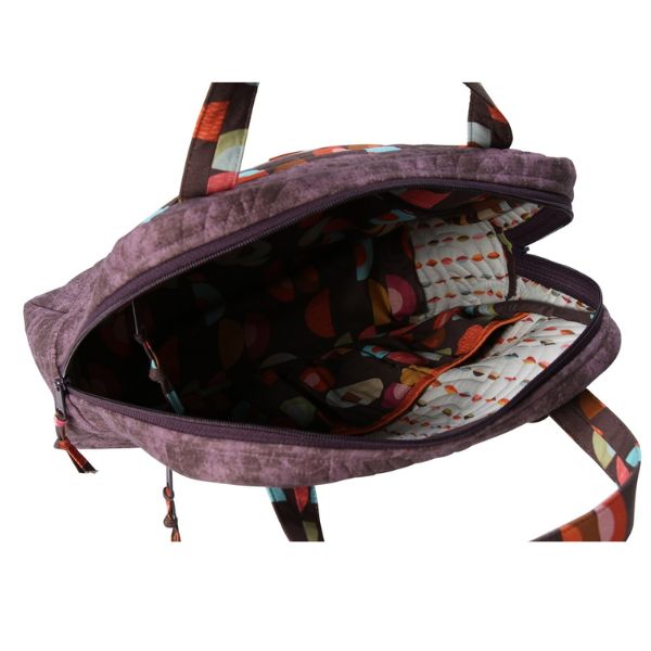 Keep everything organized with three elasticized slip pockets and a full-height zippered mesh or fabric pocket on the inside. The exterior features a full-height zippered pocket made of quilted fabric on the back and a quilted pocket on front that closes with a magnetic snap flap.