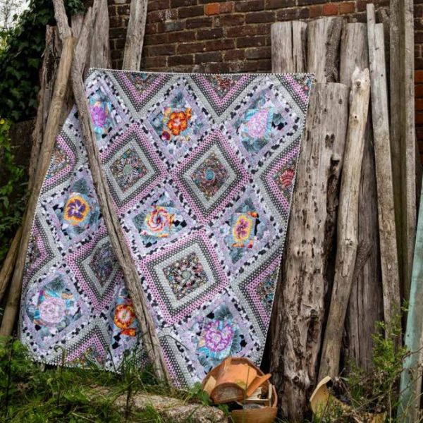 Kaffe designed this quilt with a particular book location setting in mind – silvery wood and weathered brickwork. It shows just how elegant grey can be used as a base colour for a quilt.