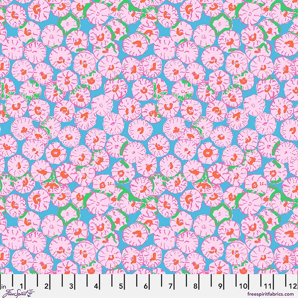 PWBM031.Pink Sand Dollar: Brandon Mably for Kaffe Fassett Collective is a design of pink sand dollars with green accents on a blue background.