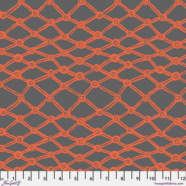 PWBM036.Grey Nets: Brandon Mably for Kaffe Fassett Collective is a design of bright orange graphic fishing nets on a grey background.