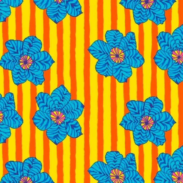 PWBM091.Orange Zebra Lily by Kaffe Fassett Collective. Kaffe Fassett Collective for FreeSpirit presents this new collection. Featuring re-imagined designs by Kaffe Fassett & new designs from Brandon Mably. This collection features an array of bright bold flowers, including rhododendrons, hyacinths, and floating hibiscus flowers.