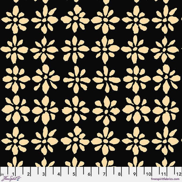 PWBM094.Black Snow Flower: Brandon Mably for Kaffe Fassett Collective, featuring pretty dark cream flower heads in a horizontal/vertical pattern, on a black background.