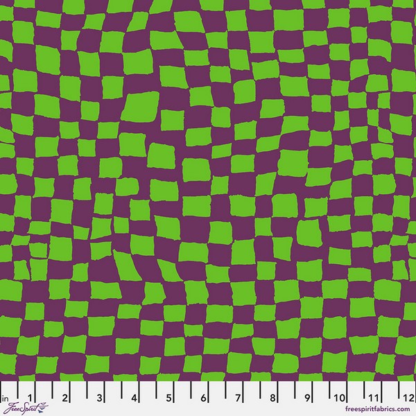 PWBM095.Magenta Gameboard: Brandon Mably for Kaffe Fassett Collective, featuring a colourful, bold abstract check design in green and purple.
