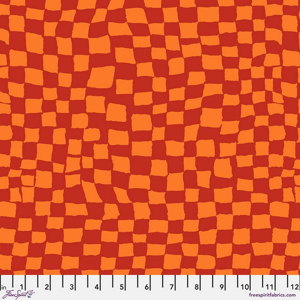 PWBM095.Red Gameboard: Brandon Mably for Kaffe Fassett Collective, featuring a colourful, bold abstract check design in orange and red.