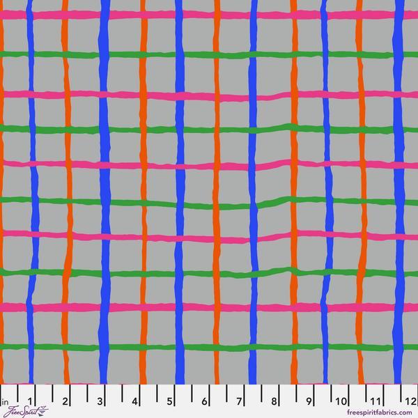 PWBM105.Grey Grid, Brandon Mably for Kaffe Fassett Collective is a check pattern of pink, green, orange and blue lines on a grey background.