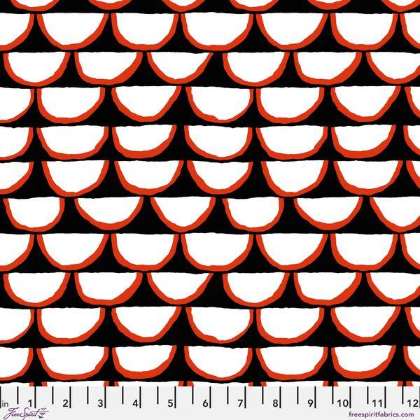 PWBM107.Black Segments, Brandon Mably for Kaffe Fassett Collective features white segments with orange trims on a black background.
