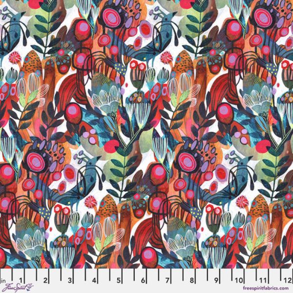 PWES038.White Cherie, Colori by Estè MacLeod is a vibrant fabric design bursting with bold colour and organic detail. Featuring an energetic mix of whimsical florals, layered foliage, and playful abstract forms, this print captures the essence of Este’s artistic style. The overlapping leaves, blossoms, and painterly textures create a lively, kaleidoscopic effect, perfect for adding movement and creativity to your projects. Whether used in quilting, dressmaking, or statement décor, Cherie brings a joyful blend of nature and artistry to your fabric collection.