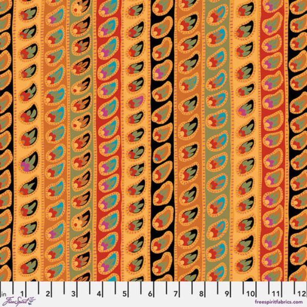 PWGP032.Antique Paisley Stripe, Kaffe: From the Archives features rhythmic vertical paisley motifs in muted antique tones soft oranges, slate greens, and dusky neutrals set against an aged cream background. This elegant striped design blends vintage inspiration with modern structure, ideal for quilts, home décor, and refined sewing projects