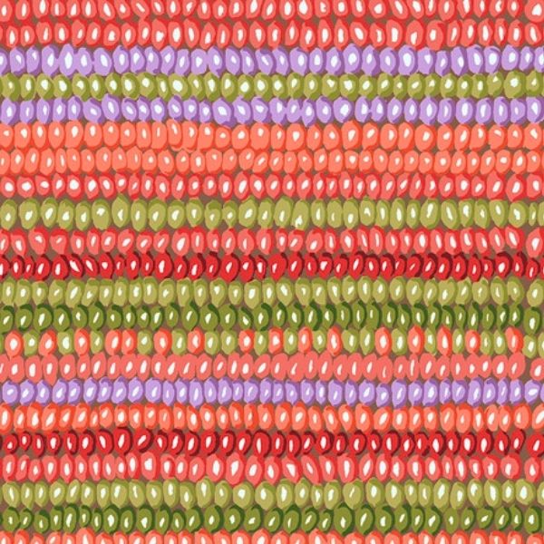 PWGP050.Jungle Bead Stripe is a beautiful red fabric featuring rows of beads in warm tones with hints of green. Kaffe Fassett Collective for FreeSpirit presents Bead Stripe in jungle as part of the Kaffe Fassett Collective limited edition Vintage collection.