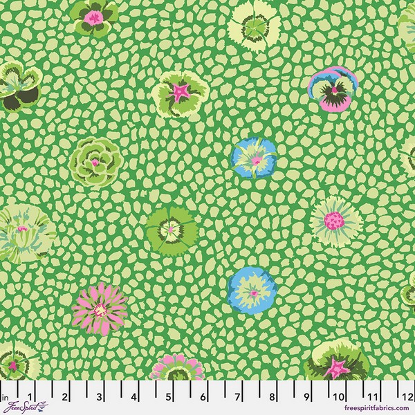 PWGP059.Moss Guinea Flower: Kaffe Fassett, featuring a beautiful colourful floral print on an abstract dotted green background.