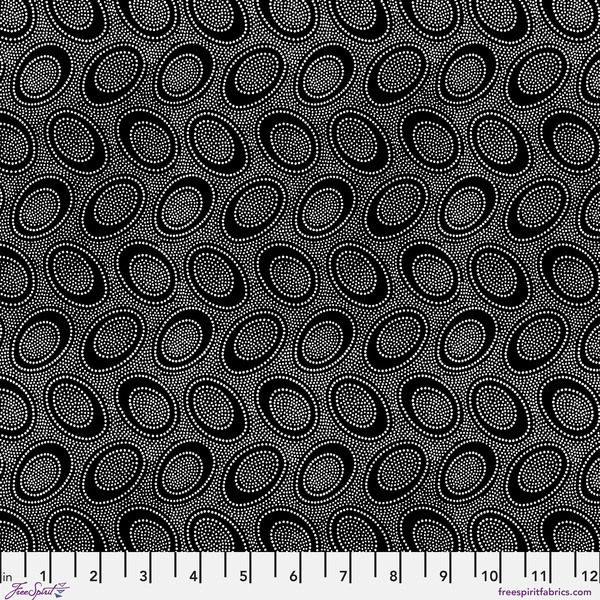 PWGP071.Black Aboriginal Dot: Kaffe Fassett for Kaffe Fassett Collective is a charming design of white dots in circles on a black background.