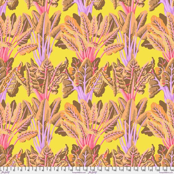 PWGP128.Yellow Chard, Kaffe: From the Archives featuring towering chard leaves in shades of russet, sienna, and blush, this vibrant design bursts to life against a zesty yellow background. The dynamic composition and painterly strokes capture Kaffe’s signature boldness, making it an eye-catching choice for quilts, garments, and eclectic home décor.