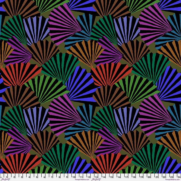 PWGP211.Dark Fanfare: Kaffe Fassett for Kaffe Fassett Collective is a design of interlocking fans in dark shades of pink, blue, brown, and green.