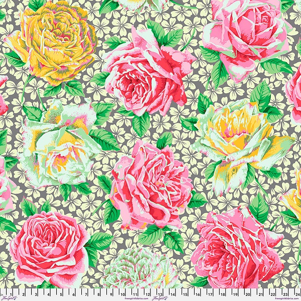 PWPJ077.Grey Rose Bloom: Philip Jacobs for Kaffe Fassett Collective is a design of large blooming pink and yellow roses on a grey floral background.