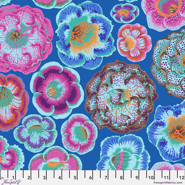 PWPJ140.Cool Helen, Philip Jacobs for Kaffe Fassett Collective features beautiful detailed cool flowers dotted on a rich blue background.