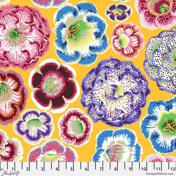 PWPJ140.Yellow Helen, Philip Jacobs for Kaffe Fassett Collective features beautiful flowers dotted on a bright yellow background.