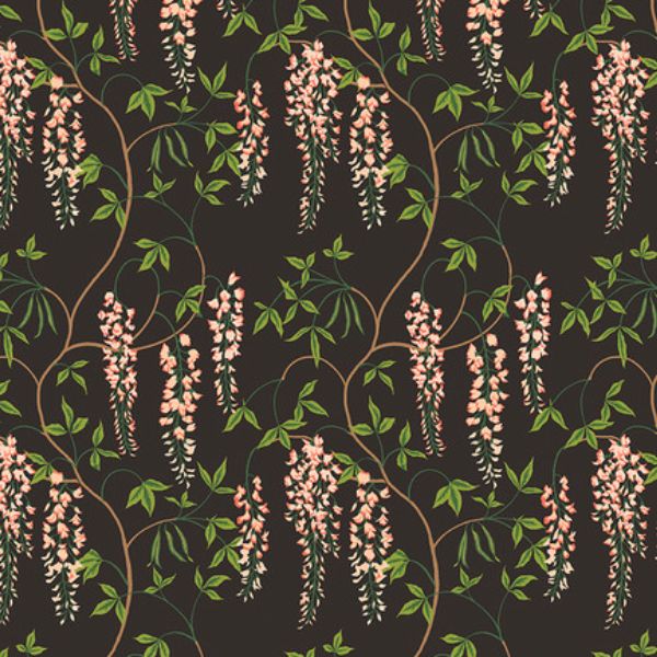 PWSA044.Black Laburnum Falls also known as the golden chain tree, the hanging blooms contrast against an intense, dark ground. Seed pods, edged in yellow and pink bring a natural elegance to this archive inspired design.