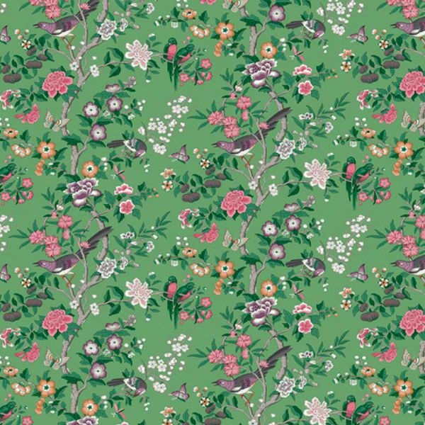 PWSA051.Green Chinoiserie Hall is inspired by a beautifully coloured archive wallpaper called Chinese Magpie, believed to be designed by William Turner (1867-1936) and produced by Jeffrey & Co. In this iteration, intricate budgies perch on delicate branches amongst springtime blossom and neat buds.