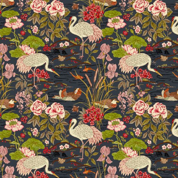 PWSA052.Multi Crane & Frog tells a story of English water gardens, Emperor ducks, characterful frogs and regal koi carp pair with irises and roses to recreate the spirit of the 1930s.