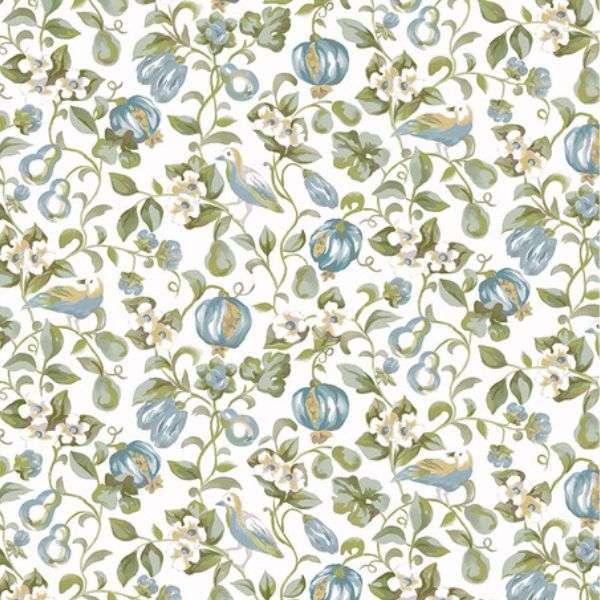 PWSA055.White Pear & Pomegranate, Southwold Blue by Sanderson is a classic design featuring beautiful foliage and small birds. A faithful painterly reproduction of an original 1930s fabric design by Hazel Wray Davey.