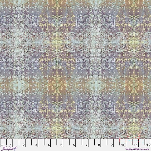 PWSE064.Glacier Rippling, One Layer Away by Seth Apter features a striped pattern of silver and gold symbols on a dusty blue and yellow background.