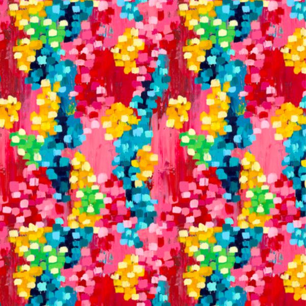 PWSP061.Raspberry Bliss by Sue Penn creates a colourful garden story. This fabric features lots and lots of squares in different colours.