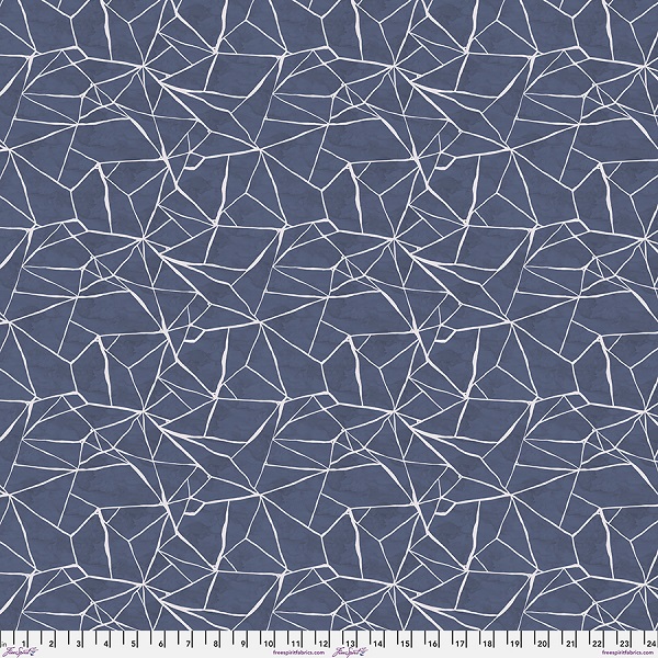 PWSR097.Bluehour Unfolding, Daybreak by Shell Rummel is reminiscent of a night sky during the blue hour, with intricate geometric patterns in white lines creating a network of polygons against a deep blue background.