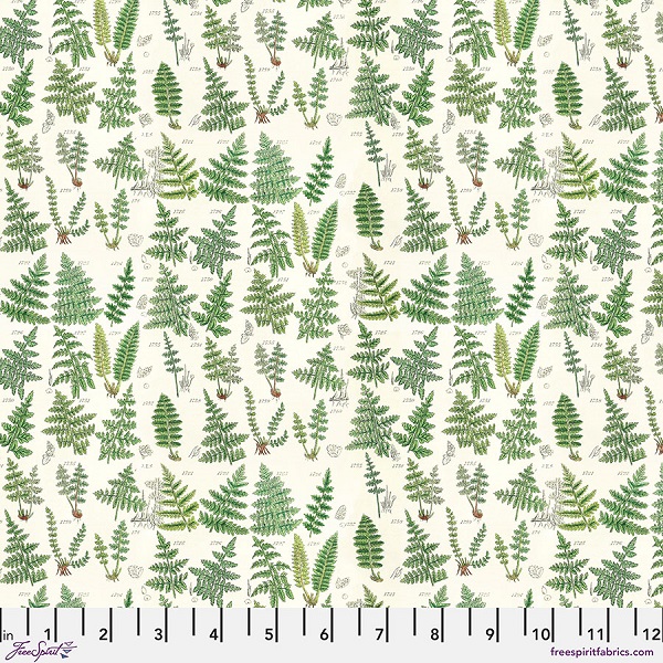 PWTH265.Green Ferns, Palette Green by Tim Holtz is a design of rows of green fern fronds on a cream background.