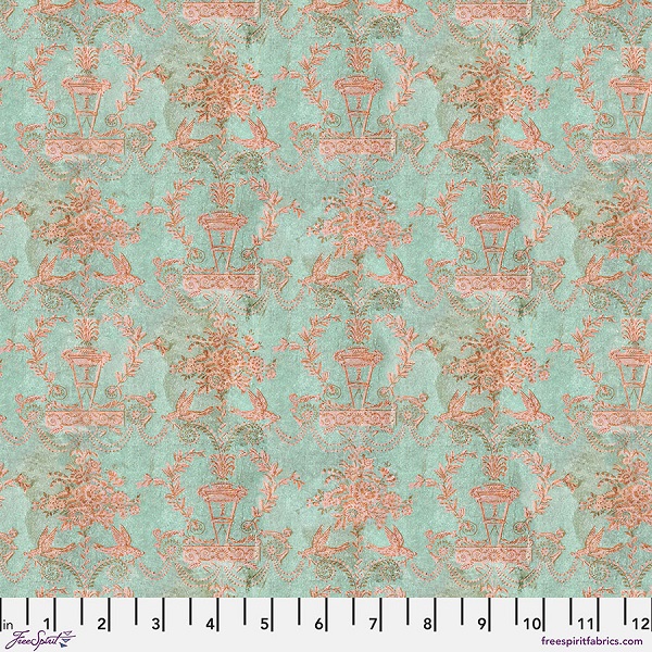 PWTH277.Teal Wallpaper, Palette Teal by Tim Holtz is a vintage style wallpaper design in teal with pink motifs.