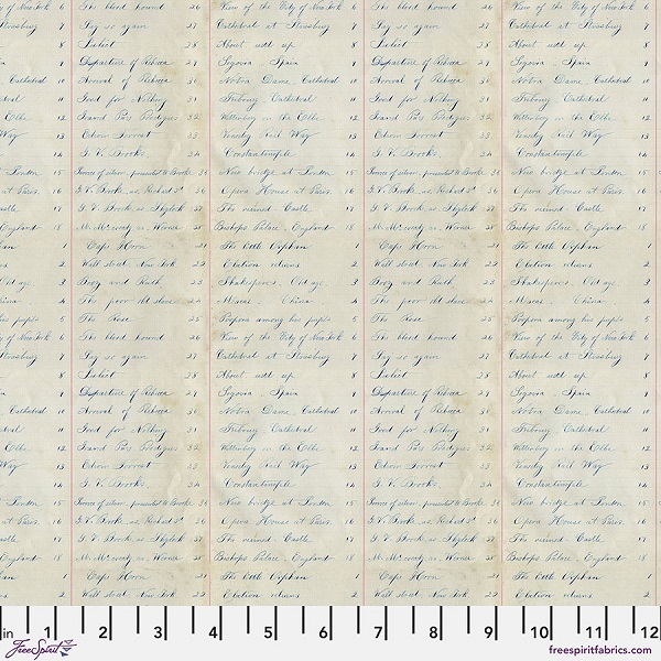PWTH294.Indigo Ledger, Palette Indigo by Tim Holtz is a design of columns of ledger entries in blue handwriting on a cream background.