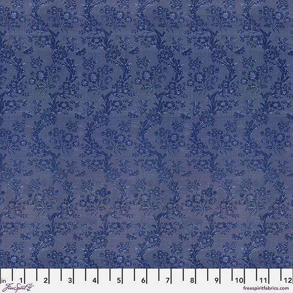 PWTH296.Indigo Tapestry, Palette Indigo by Tim Holtz is a design of delicate tapestry style indigo flowers on a blue background.