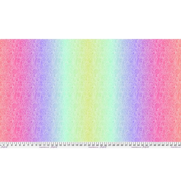 PWTP270.Deepdive, Floral Reef by Tula Pink is featuring a stunning ombré blend of rainbow hues. The design transitions gracefully through soft shades of pink, lavender, aqua, and lime, enhanced by delicate swirling coral like line work. This dreamy gradient design captures the serenity and magic of the ocean’s depths, perfect for quilts, backings, and statement pieces that radiate colour and calm..
