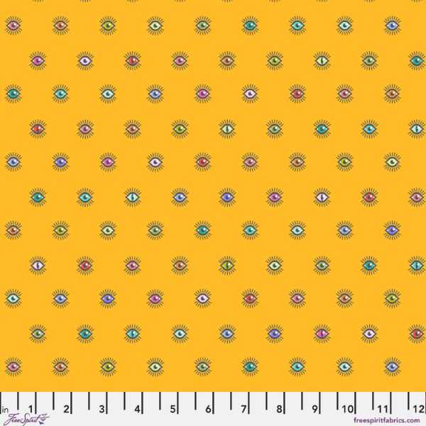 PWTP287.Dandelion Visionary, Legendary by Tula Pink features a fun design of colourful eyes on a vibrant yellow background.